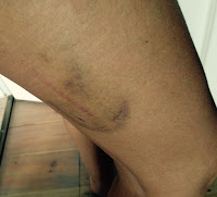 Igal juhul Amservi paat püüdis vahepeal konkurentsi pakkuda, kuid ega tal see hästi ei õnnestunud. Ikka saime ette ja möödagi. Selge ka oli, et pautide ajal tehtud kibekiired liigutused on jalgadele juurde toonud mitmeid ja mitmeid sinikaid. See enam ei põhjusta meelehärmigi, kuidagi tavaliseks on muutunud. Esimese lubatud suurema sinika lisan postitusele, selle sain olümpialootustega purjetades. Siinjuures saan küll lubada paremaid tulemusi, sest pingutanud olen.
