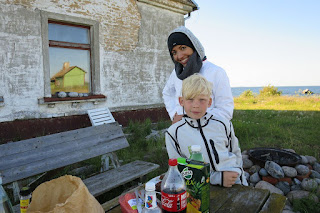 Siis aga hakkas Keri paistma ja kapten Mikule tundus, et nende laintega me saarele teab mis lähedale ei saa. Ehk seetõttu see saar nii eriline ongi, et sinna ei pääse niisama lihtsalt. Teadmisi, oskusi ja vaat, et tutvusi on vaja. Meil oli väike kummipaat sabas ja niikuinii oli plaan sellega rahvas saarele vedada. Esimesed läksid - lapsed ja Brigita. No siis keegi veel ei arvestanud, et need lained ka üle pea laksuvad. Rainer sai nii märjaks, et otsustas lõpus üldse vette hüpata (viimaste vahetusriiete ja koos telefoniga). Jummel, meil oli kahepeale veel kaks paari riideid. Nii tuli minul bikiinide väel saarele sõita, et üks paar saarele jõudes selga panna ja teine külmetavale lapsele. Vastu võtsid meid imetore paar Tartust, Heli ja Avo, kes saarel vahi ülesandeid täitmas ja samas ka oma hõbepulma veetmas. Vat see oli alles hõbepulmareis! Lubasid nemadki, et kuigi see on esimene nädal saared, ei jää see kindlasti viimaseks ning järgmiseks aastakski on nädal kirja pandud.